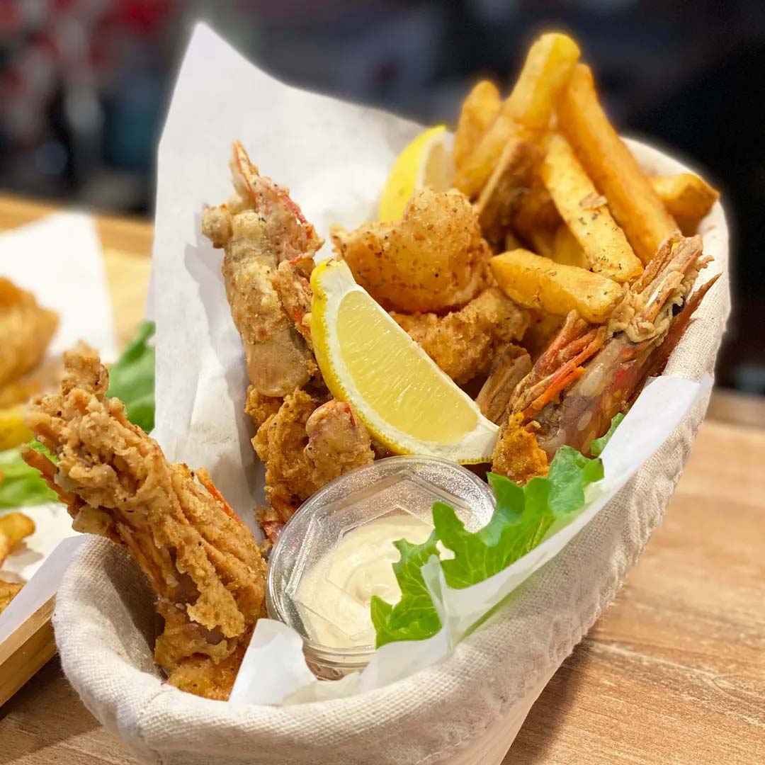 Vores saftige fiskeburger, friturestegte blæksprutte, sprøde fish and chips og andre lækre fiskeretter giver et frisk pust til din dag.
